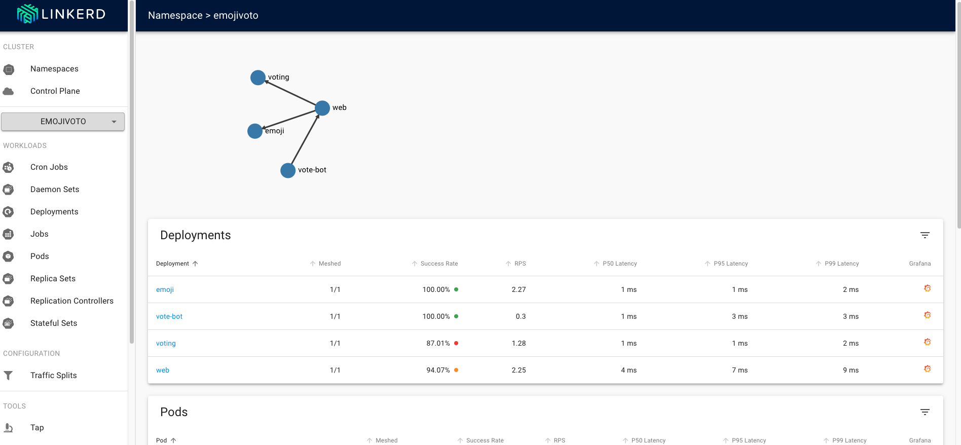 上面的命令首先获取在 emojivoto 命名空间中运行的所有 Deployments,然后通过 linkerd inject 运行它们的清单,然后将其重新应用到集群。